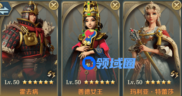 这套阵容由霍去病、善德女王和玛利亚·特蕾莎所组成。霍去病与玛利亚·特蕾莎都具备比较强的输出能力,尤其当敌方处于负面状态时,霍去病可以增加物理暴击率,玛利亚·特蕾莎则可以提供治疗效果,二者一攻一辅。