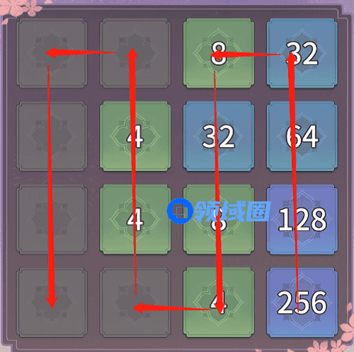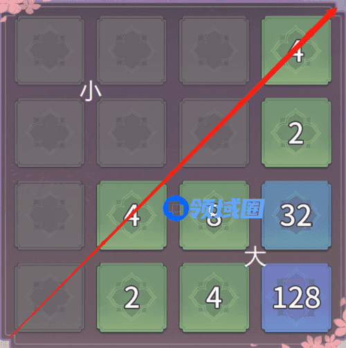 3、如果想拿到单局的高分数,那么没有技巧是不行的,下面也是跟大家说说具体规则和技巧,助大家打高分!正常打开游戏的界面,会只有两个2,并且我们每次移动后都会出现一个2,数字大了之后会出现4和8,只有数字相同,才能够相加,并且每次相加之后都会变成原本的二倍,比如两个2相加变成4,两个4相加变成8。由于每次空格里随机出现的数字是2和4,所以基本的策略是将较小的数字(2、4、8…)接触到空格的概率最大化。具体来说,就是让现有的较大数字尽量在某个远离空格的角落,较小数字在更更接近空格。故而操作的时候可以尽量只按下和右,按上的时候保证纵向是满的,避免下图中128下面出现随机数,实在不能动的时候再按左。