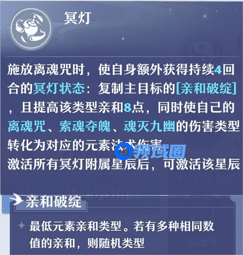 单鬼道、双输出流鬼道专用,释放离魂咒可以复制目标的最低元素类型,并提高相关的元素亲和,哪怕目标有多种相同的元素亲和,也会随机获得一种。由于非神兽灵兽都有元素克制的特点,所以冥灯鬼道在清宝宝方面都非常拿手。