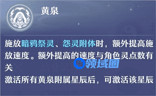 简单明了的辅助技能,施放暗鸦祭灵和怨灵附体时可额外提高施放速度,双鬼道中的次输出可以选择。这也使得次输出鬼道也可以10灵或灵耐,而不是灵敏加点。
