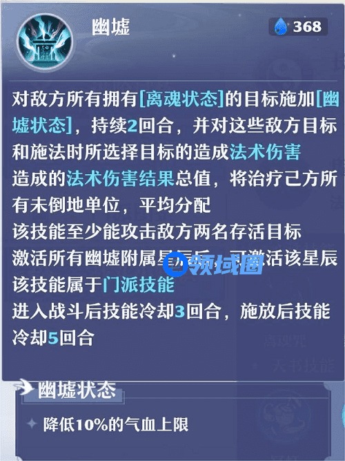 幽墟能对主目标及所有离魂状态目标造成伤害,并根据伤害值治疗友方全体。该技能伤害上限高下限低,非常吃操作。大家要注意的是,除了主目标以外所有拥有离魂状态的目标都会受到伤害,所以操作要点有两点。