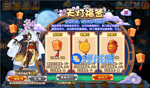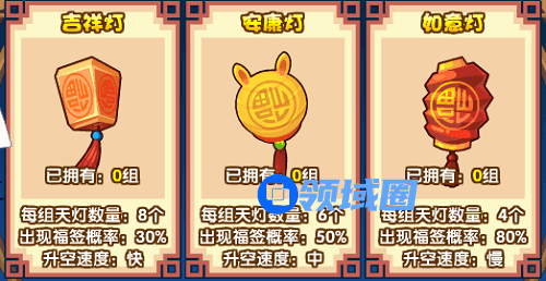 3、每日有五次获取天灯的挑战机会,战胜如意毒王、锦绣蝶后可以随机获得一组天灯!每一组天灯出现福签的概率和升空速度不一样哦: