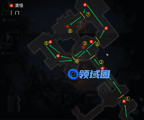 ① 清小怪,门自动打开 → ②清掉小怪,门自动打开 → ③击杀小BOSS血红女祭司殷娜洛丝,对话 → ④开门 → ⑤沿路线清怪 → ⑥清怪后门自动打开 → ⑦清怪,门自动打开 → ⑧击杀大BOSS女伯爵,结束副本