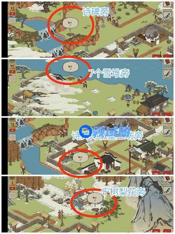 诗碑旁;7个雪堆旁;徽墨工坊旁 ;千树梨花旁(被松树挡住了)