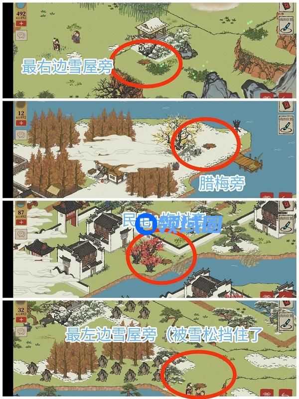 最右边雪屋旁;腊梅旁;民宅+梅树旁;最左边雪屋旁(被雪松挡住了)