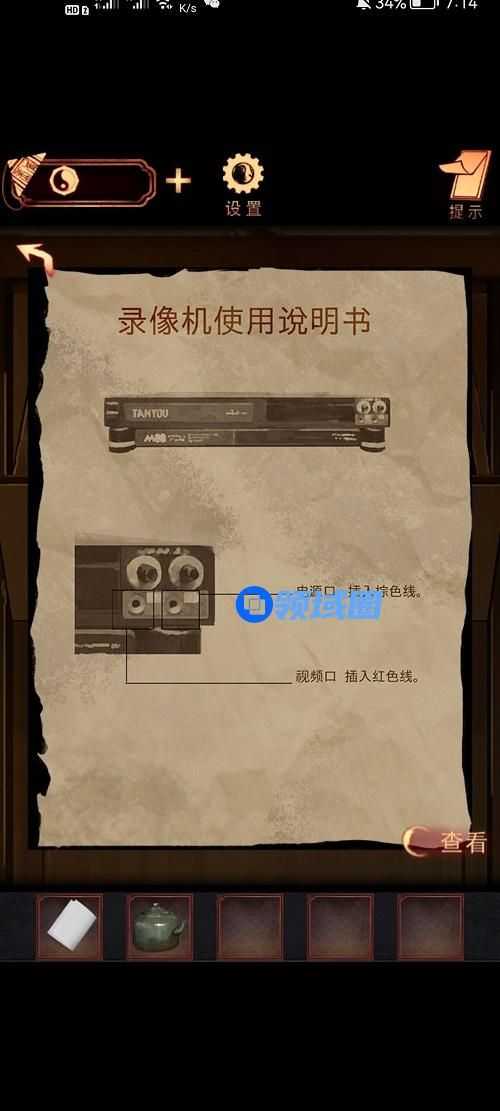 点击墙上的海报,再查看电风扇,再点一下它的电线插头,可以看到海报底下的密码,根据海报上人物的数目,得到密码的排序,打开电风扇旁边的柜子,查看录像机的使用说明书,得到视频线。