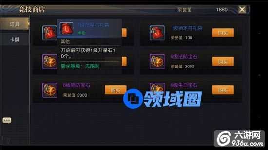 升星石:一级升星石,记住不要用钻石买,留钻石买别的战力道具除了礼包,系统送的和每日任务奖励的还可以在竞技场商店用荣誉购买(本人三测把升星石用完了,后来在多宝阁买了两千钻的一级升星石,结果装备都升到十二星了,一级不能用,每天看着包包里的一级升星石堆成堆却没有钻石买合成道具,一百钻一个太贵了)。