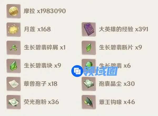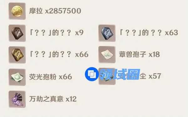 2.其中月莲为须弥特产采摘物,断片为无相之草等boss掉落物,蕈兽孢子,孢素晶尘,荧光孢粉为蕈兽掉落物,如下图所示: