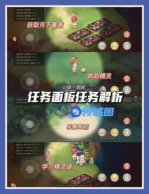 ①右界面会有任务面板,大家可以根据提示完成(包括获取月下蔷薇采摘,采集草药,救助精灵,学习精灵语)。