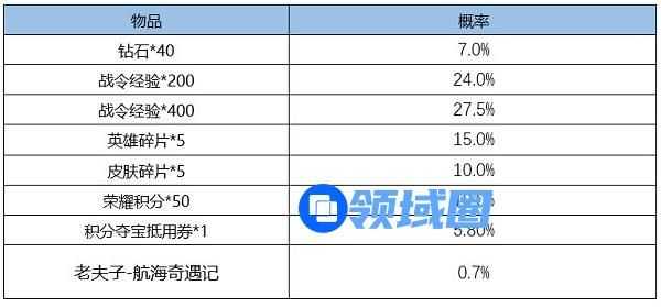 打开可随机获得以下奖励之一:老夫子-航海奇遇记、积分夺宝抵用券*1、英雄碎片*5、皮肤碎片*5、荣耀积分*50、200/400战令经验、钻石*40。