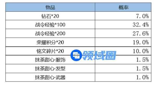 打开可随机获得以下奖励之一:抹茶甜心·发型、抹茶甜心·服饰、抹茶甜心·武器、荣耀积分*20、100/200战令经验、钻石*20、铭文碎片*20。