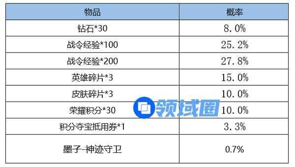 打开可随机获得以下奖励之一:墨子-神迹守卫、积分夺宝抵用券*1、英雄碎片*3、皮肤碎片*3、荣耀积分*30、100/200战令经验、钻石*30。