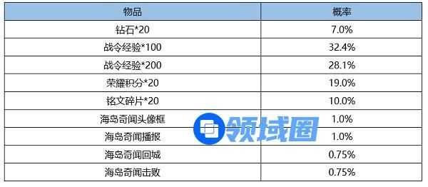 打开可随机获得以下奖励之一:海岛奇闻头像框、海岛奇闻播报、海岛奇闻回城、海岛奇闻击败、荣耀积分*20、100/200战令经验、钻石*20、铭文碎片*20。