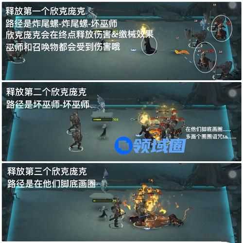 3、释放第一个欣克庞克,路径是炸尾螺-炸尾螺-坏巫师,欣克庞克会在终点释放伤害必缴械效果巫师和召唤物都会受到伤害哦,释放第二个欣克庞克,路径是坏巫师-坏巫师,释放第三个欣克庞克,路径是在他们脚底画圈。