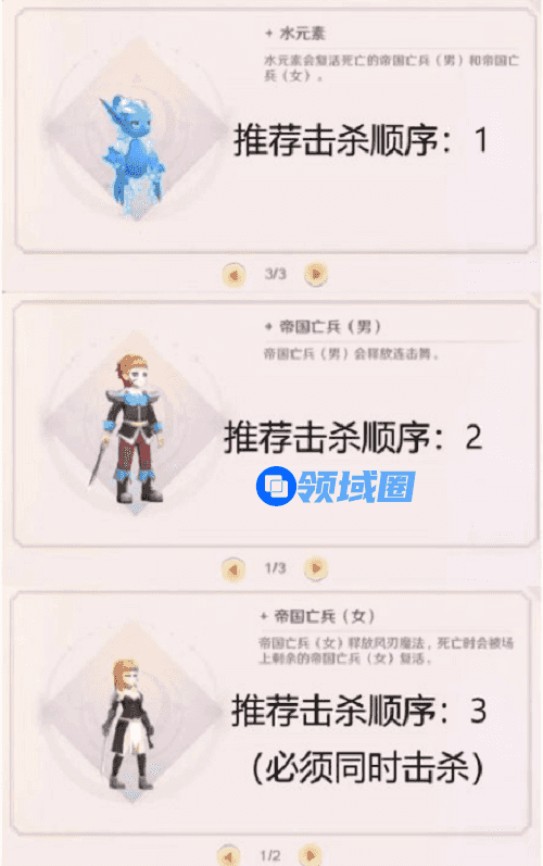 1、击杀顺序推荐:水元素>帝国亡兵(男)>帝国亡兵(女)。
