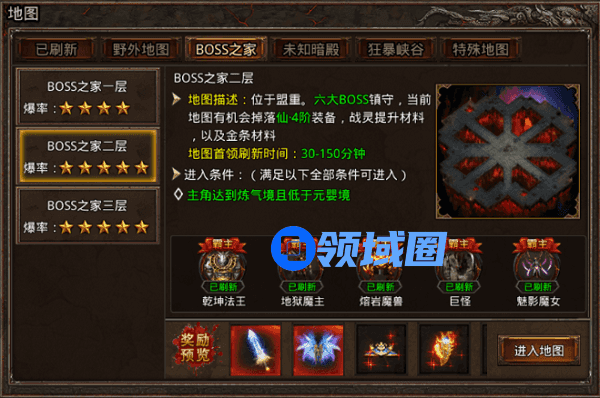 1.BOSS之家一层:前期达到80级即可进入,是个不错的公共地图,前期争夺非常激烈,牛魔王能掉落火龙装备,该地图更多的是能打17,18阶装备,让玩家能够更快地提升自身战力;地图内怪物刷新得很快,第一天前往这里挑战首领,能快速把一些低阶装备首爆奖励都提取出来,但因是公共地图,大家做好打架的心理准备,多组织自己行会的小伙伴,再来一起挑战吧。