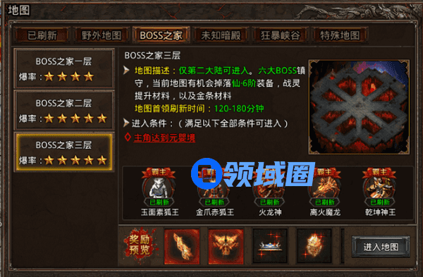 3.BOSS之家三层:达到元婴境后即可进入,地图怪物最高掉落神龙装备,且最小的怪物也是金丹境的,地图内怪物对于自身英雄的斗转值要求都是有的,想要越级挑战这些怪物的话,那么自身英雄的火龙之心等级一定不能过低,加油提升自己,再来挑战吧。