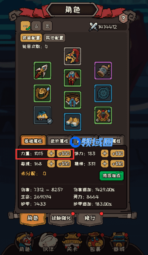 3、默认的新手方案是 [力量:敏捷=1:1] 加点。对于新手来说初期最推荐全加力量:力量影响角色的生命值和伤害,高伤害可以更快打死怪物。