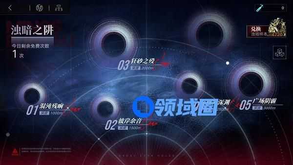 1.在目前已知的情报中,【浊暗之阱】内共有3000m深度5个关卡。玩家每日可获得1次免费进入探索的机会(使用[净化剂]可获得额外探索次数)。