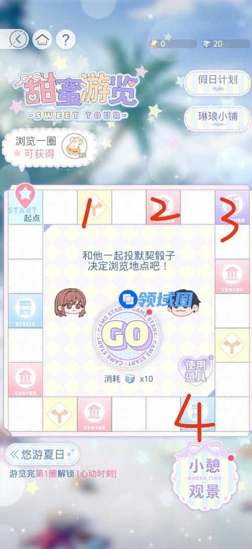 1、先去【小憩观景】通关7个关卡,战力够的剩下的三次全部刷第七关,再回到游览界面,和你一起选择的男主掷骰子。