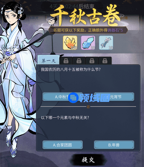 一念逍遥千秋古卷是中秋节的答题活动,玩家需要根据题目回答正确答案,游戏宝小编带来一念逍遥千秋古卷第一天答案攻略,希望可以帮到大家。