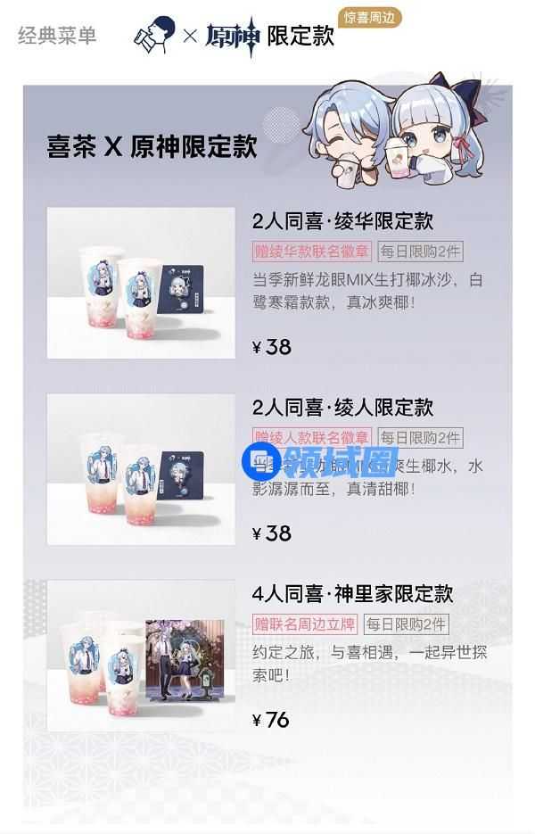 2.购买双人套餐可获得神里绫人(绫华)徽章,四人套餐可以获得联动立牌,以及你要是个狼灭的话,一次性炫足八杯可以拿满联动周边。
