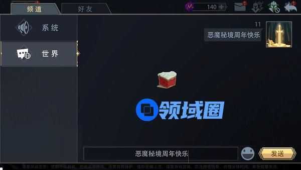 3.获取方式:在【世界聊天】界面输入“恶魔秘境周年快乐”后,界面正中间会出现“蛋糕块”