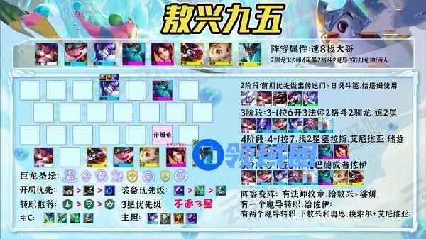 3、除此之外不建议大家上6/8风暴,特别是当前版本。诺姆希的伤害遭受到了大幅度的削弱,即使不开3驯龙羁绊,2驯龙的伤害也少了很多。因此前排的坦度就非常重要,前排支撑时间长,保证敖兴能够释放2-3次技能就能够收割全场。