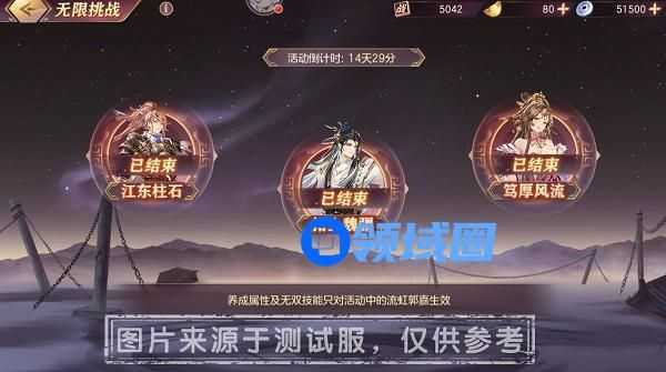 1.在活动的第1日,第3日,第5日将分别开启【江东柱石】、【拓土魏疆】、【笃厚风流】三个阶段的无限挑战。