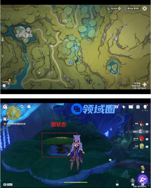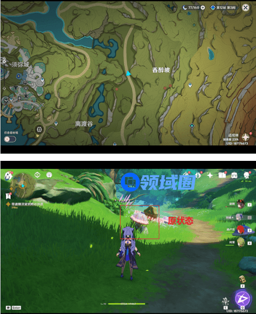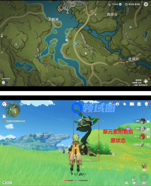 来到化城郭西方向如图位置,找到能抬起巨石的蘑菇,注意首先要使用草元素附着将蘑菇抬起巨石。分别依次进行原状态拍摄、雷附着后进入活化状态拍摄(如图,蘑菇长高)、火附着进入枯焦状态拍摄(如图,蘑菇变矮)。按“Z”进行拍摄。