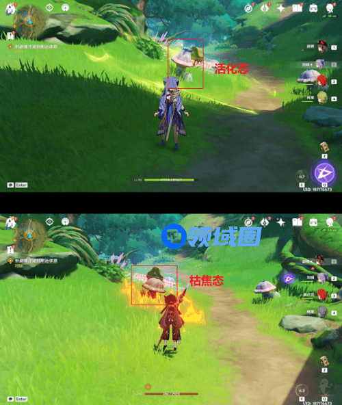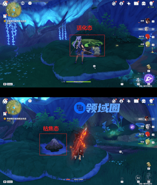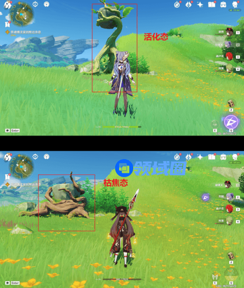 注意!建议以原状态、活化态、枯焦态为顺序进行拍摄,如果进入枯焦态这一不可自动复原状态,草元素附着即可回复原状态!队伍中要含有草元素、雷元素、火元素角色!