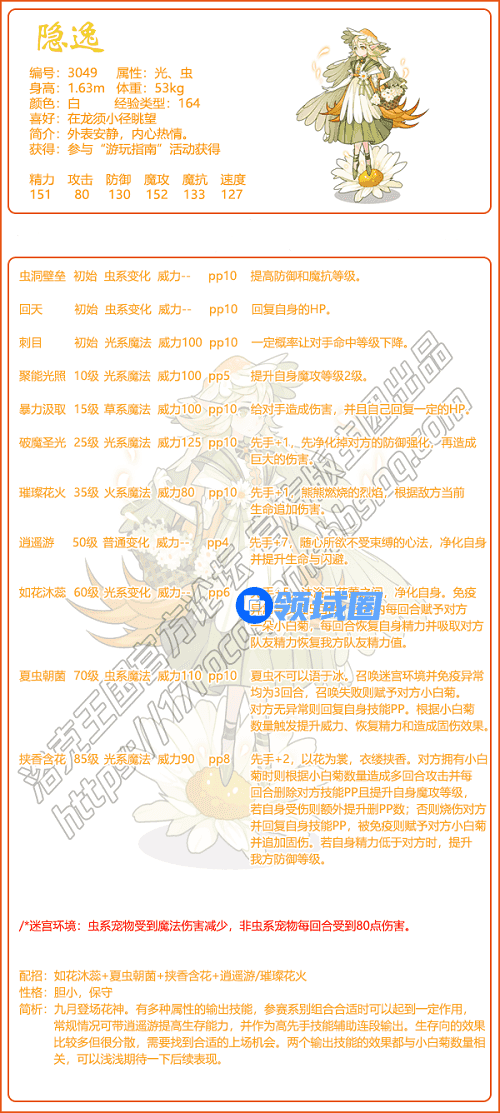 3、简析:九月登场花神。有多种属性的输出技能,参赛系别组合合适时可以起到一定作用,常规情况可带逍遥游提高生存能力,并作为高先手技能辅助连段输出。生存向的效果比较多但很分散,需要找到合适的上场机会。两个输出技能的效果都与小白菊数量相关,可以浅浅期待一下后续表现。