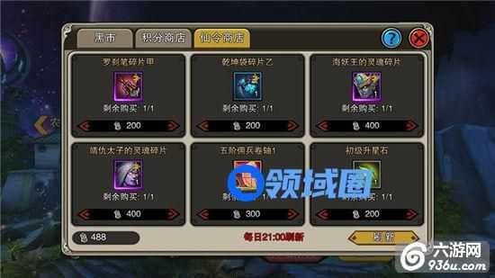 在家园系统里往后面拖动还有一个家园商店,商店里有各种道具碎片,玩家可以通过仙令来兑换游戏道具,仙令可以通过驻守还有抢夺玩家得到,所以每天驻守家园和抢夺就能积少成多,在商店里兑换到你想要到的道具。