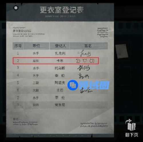 根据船长卡布签名处的3个符号,在更衣室登记表的背面符号中寻找三个符号,将相同的符号进行连线获得密码:573