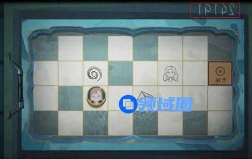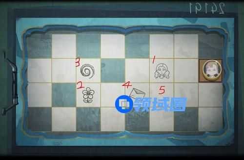 在门口处玩棋盘游戏,棋盘上的数字指棋子走的步数。按照提示步数,按照顺序依次走2步、4步、1步、9步、1步。观察棋子行动轨迹可推测棋盘规律:棋子只有在碰到蓝格的时候才能够转弯,因此棋子的最后一步只能向右走1步。