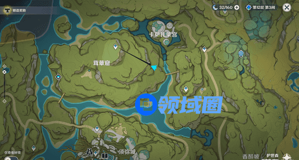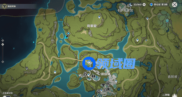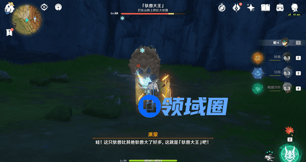 1.来到茸蕈窟传送点,直接飞往东南方向的这个位置,这边可以找到一个npc,与npc对话,得知他是来自枫丹的猎人桑顿,想要防止一些森林里的凶兽,根据他的提示有三种凶猛的动物,并且提供了大致方位。