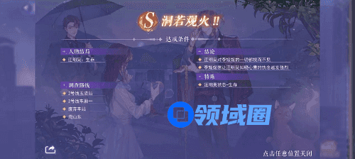 1、首先是S级洞若观火结局。在这个结局中我们得到两个结论。分别是【汪明昊对李媛媛的一切都视而不见】,【李媛媛想让汪明昊知晓心意的执念越发强烈】。关键人物【汪明昊】的状态为生存。达成本结局需要在1-3【废弃车站】的3选1选项中优先选择带有医疗的角色来治疗汪明昊,然后拼出来情书询问汪明昊,在1-4的推理环节中选择情书。