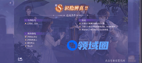 4、最后就是隐藏S级识隐辩真结局。该结局中关键人物【汪明昊】的状态为生存。得到【车厢内不断重现着80年代的幻象】【丁晓月为阻止李媛媛继续犯错,制造的坍塌】,【李媛媛与丁晓月的状态反差很奇怪】。达成本结局的条件为首先完成普通的S结局,然后回溯到1-2的车厢中,将1-2的所有隐藏信息找到,并且完成【特殊调查:流浪汉的家当】,然后选择前往1-4的隐藏位置,获得全部隐藏信息,然后再回溯到1-3选择和丁晓月进行对话。收集全部线索,就可以达成隐藏结局。