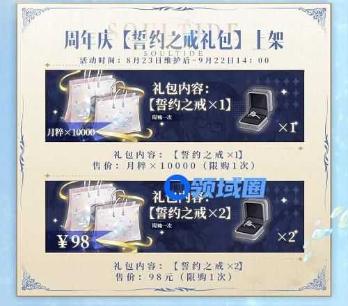 戒指礼包:如果氪金少(不打算一次性氪金结婚超过一半以上人偶的),或者完全不氪金,10000月粹的戒指是值得的,如果已经婚完一半以上或者准备婚一半以上,那么不太建议月粹购买戒指。98双戒除非你的双倍首充额度又全部用完,这个也是不建议的,毕竟双倍只要68就可以得到两个戒指。