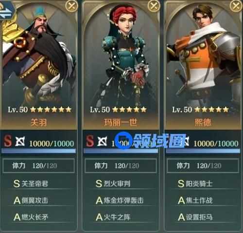1、初阶灼烧队是游戏初期较为容易组合的开荒阵容,核心自然是不难获得的关羽,而与其搭配的也是非常易得的玛丽一世和熙德。熙德是初始可选的英雄之一,而玛丽一世则在前期完成任务后就能免费获得。这个简单易上手的灼烧组合性能也并不弱,三个英雄本身具有的命运之网效果可以直接为敌方主将施加灼烧状态,并且在灼烧后还有几率施加缴械效果,可以说完美地适配关羽的技能,能让其有更好的机会打出高额爆发。