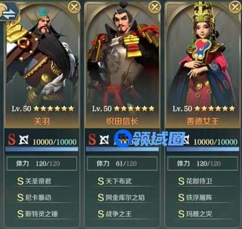 2、在开荒完成,逐渐进入到进阶发展期时,我们的灼烧队可以通过新的搭配思路提高关羽的生存能力。这个进阶版灼烧队由关羽,织田信长,善德女王这三个英雄组成,这个队伍主打的是先手防控,为关羽创造良好的输出环境。