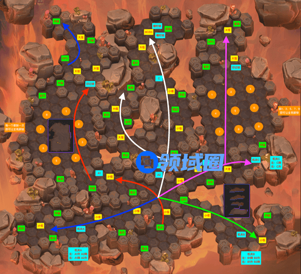 7、确定粉线全线资源都领取后,再回来走一次绿线,再次启动机关B,把右侧区域封闭,这样中间区域就全被打开咯。