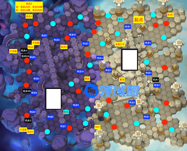 1、在起点位置,走向永恒之书,触发剧情,随后进入传送1对面区域,清除小怪(3个小能量),然后前往传送3清除小怪(2个小能量),找到机关1触发剧情