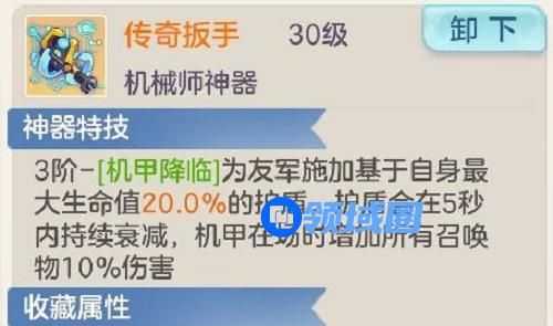 4、传奇扳手:提升终极技能-机甲降临;增加效果:为友军施加基于自身最大生命值20%的护盾,护盾会在5秒内持续衰减,并且机甲在场的情况下增加所有召唤物一定的伤害;在有一定的保护,同时能打出成吨的伤害,是输出提高的神器