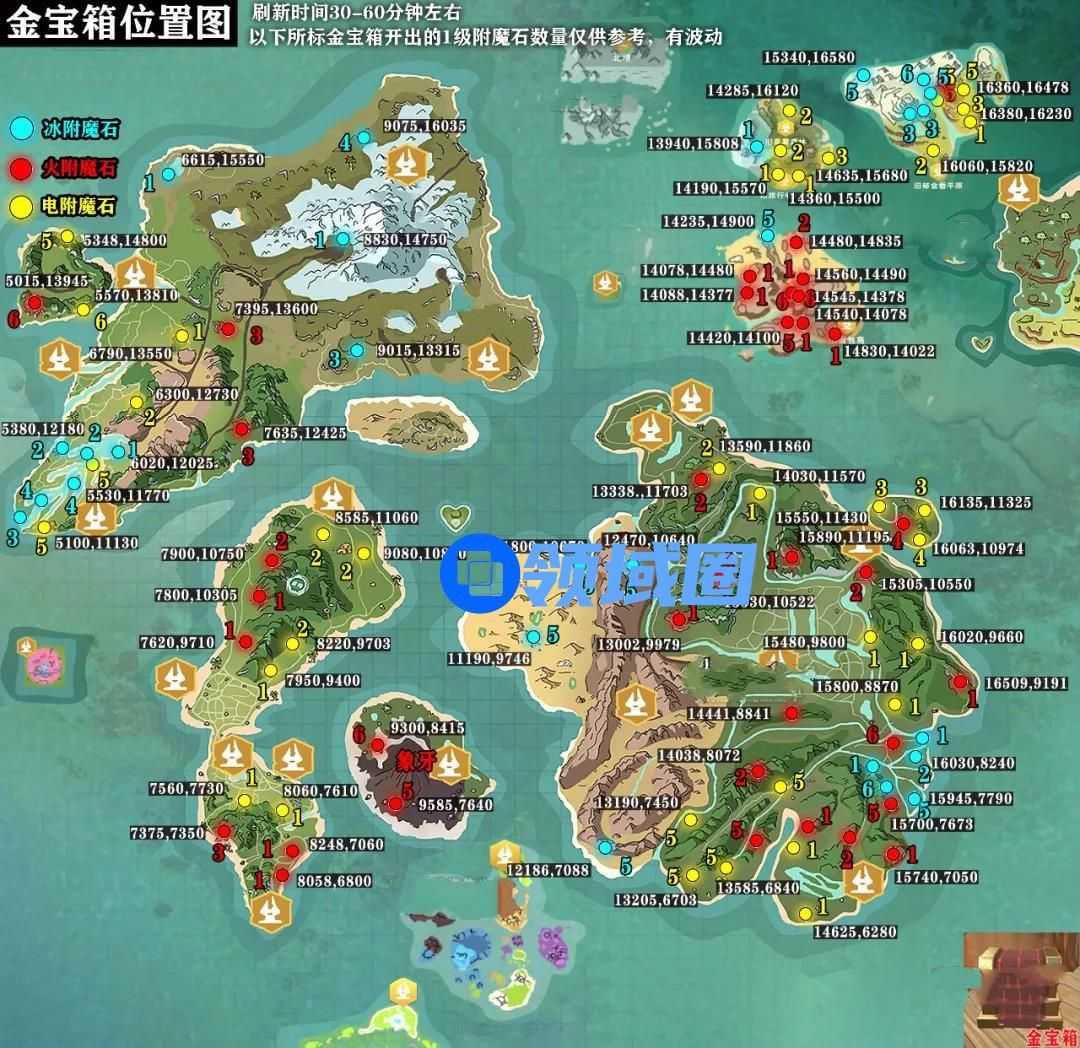 1、上图所标金宝箱开出附魔石数量仅供参考,具体以实际开出为准,大家按照游戏宝小编提供的金宝箱坐标就能轻松找到了。