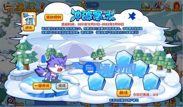 活动界面有6块寒冰,需要小洛克们由下往上冲破寒冰,点击冰块前往指定的地图进行破冰挑战,会遇到小狼仔,战胜即可,每天有三次挑战次数,两天就可以把小狼仔带回家进化咯~