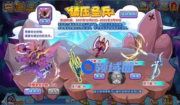 前期需要通过虚弱挑战守关的boss进行削减,每次战胜可削减8~13点圣力值;后期圣力值低于50则需要前往指定地点拾取圣兵器进行增强,道具每隔1分钟出现一次,提交一把可以获得2~7点圣力值。(每次增强扣除1个道具,背包内的所有宠物主属性与该圣兵主属性一样,道具增强的圣力值则改变为1点。如背包内宠物的主属性有不一样则无法改变)