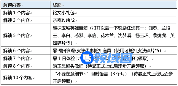 活动奖励:英雄自选宝箱*1、全新踏玉暃檐头像框、全新限时语音“不要在意细节~”(3个月)、暃-碧珀绯影皮肤优惠抵扣道具(可抵5个皮肤碎片)、新英雄暃1日体验卡*3等