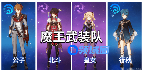 2、魔王武装队,在万达国际队没出来前,就是公子主流的玩法,缺点也是一样,位置基本锁死,这个队伍强的不是魔王是驾驶员北斗+皇女,皇女位置可以用雷神替代,行秋位置可以用砂糖、万叶、班尼特位置替代。