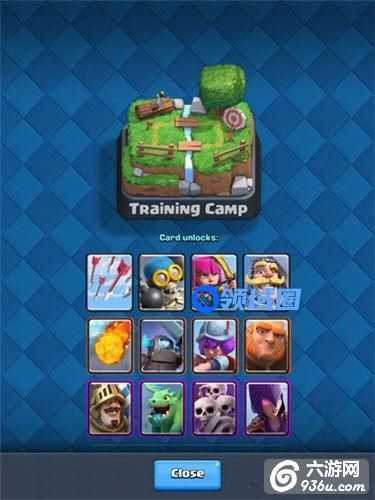 在A1阶段玩家解锁的卡牌共计18张(注:解锁并不代表可以使用,想使用需要先通过开启宝箱或用金币购买来获取该张卡牌。另外,从高阶竞技场降杯下来的玩家所持有的部分卡牌不在本文讨论范围内),其中训练营阶段解锁的12张卡分别是:万箭齐发、炸弹兵、弓箭手、骑士、火球、迷你皮卡、火枪手、巨人、王子、飞龙宝宝、骷髅军团、女巫。